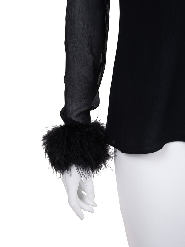 Black silk crepe long sleeve zip up top with ostrich feathers around the neck line and the sleeve hem.