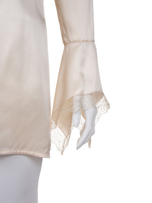 Ivory silk satin long sleeve blouse with flared lace sleeves, lace edged neckline with detachable bow, and front half button down closure.