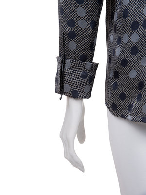 Blue and white checkered and polka dot blouse with French placket, pointed collar, long sleeves with zippered cuffs, and front button closure.