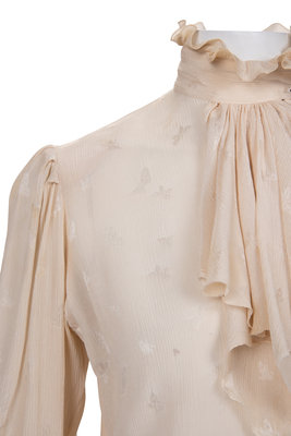 Cream silk crepe blouse with satin weave butterfly pattern, long ruffled detail on the collar, flounced long sleeves and front button closure.