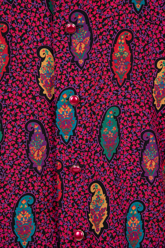 Multi-colored paisley blouse with a banded collar, cuffed long sleeves, and center back button closure.