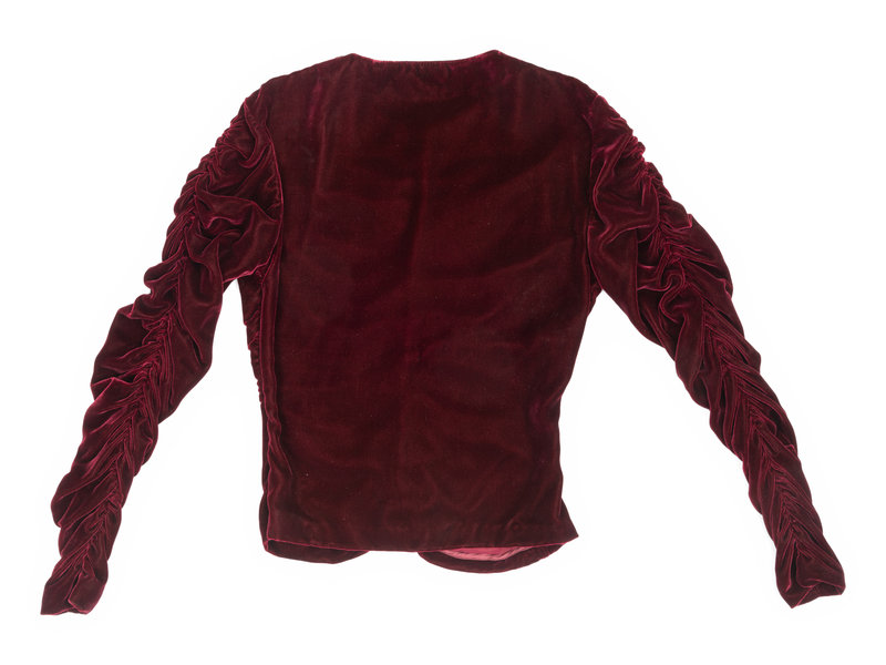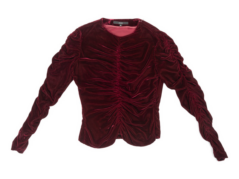 Burgundy rayon/silk blend velvet top with ruched center front and long sleeves, and center back zipper closure.