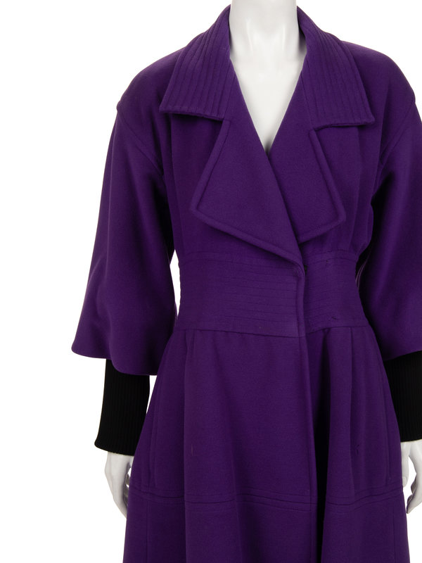 Purple wool/cashmere coat with exaggerated notched lapel, dropped shoulders into flared sleeves with black rib knit cuffs, full gathered skirt, and front button closure.