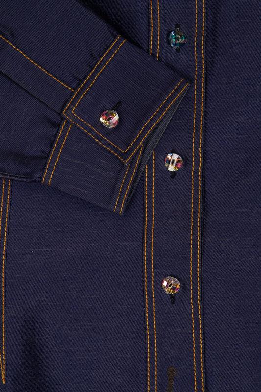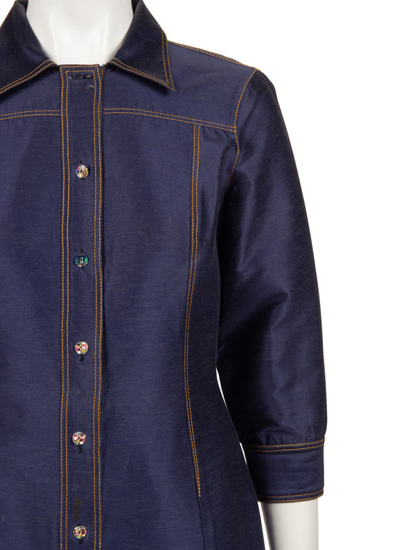 Blue cotton/rayon/silk blend twill shirt dress with convertible collar, 3/4 length sleeves with barrel cuffs, flared hem, and front faceted button closure.