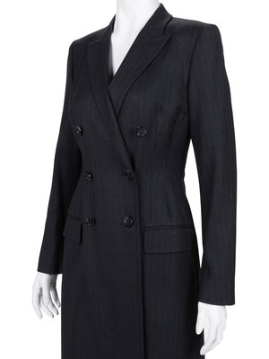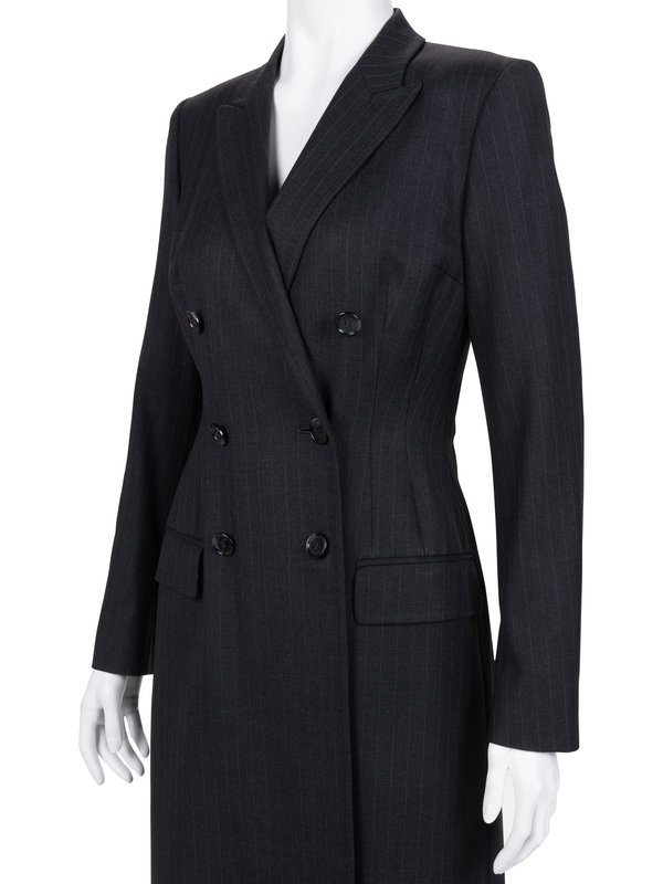 Gray worsted wool pinstripe long double breasted coat with small peaked lapels, padded shoulders into long sleeves, hip flap pockets, and front button closure; paired with matching cuffed wide-leg pants with front fly closure.