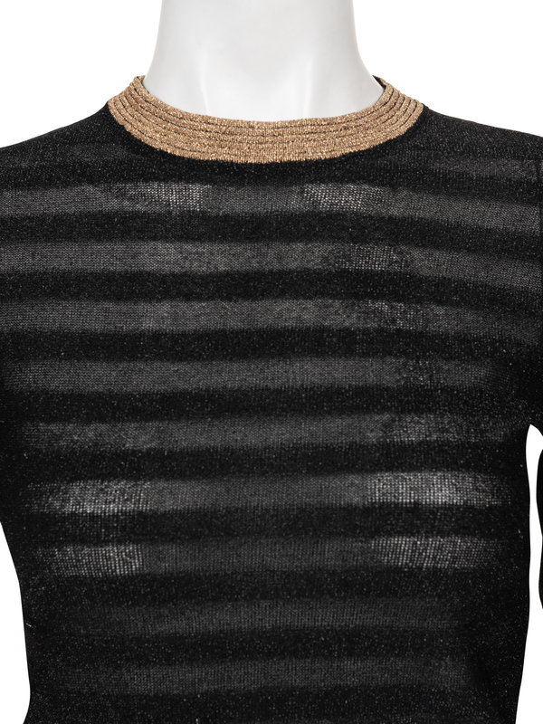 Black lurex sheer knit striped sweater with gold lurex crew neck line, long sleeves with ribbed knit cuffs, and rib knit hem.