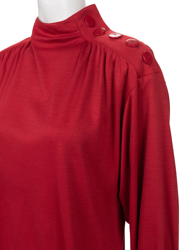 Red acrylic/wool blend knit long sleeve top with mock neck collar, cuffed long sleeves, and buttons closure going down the side of the shoulder seam.