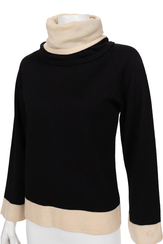Black wool sweater with black and cream cowl neck, flared long sleeves with cream colored cuffs and hem line.