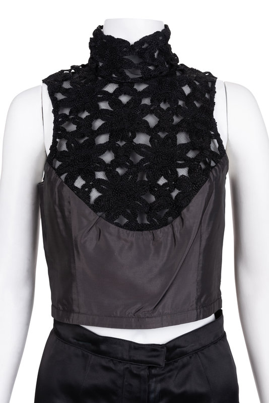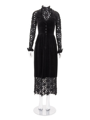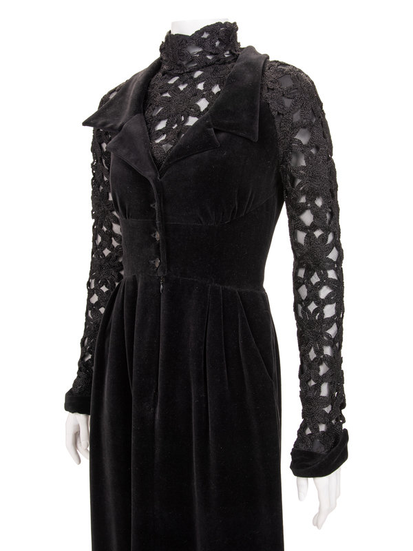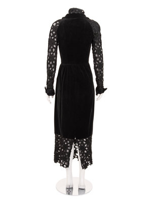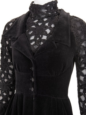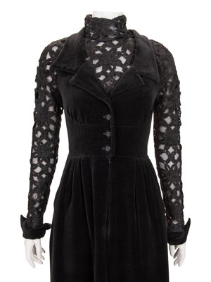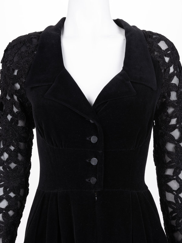 Black cotton/polyamide blend velvet dress with floral shaped rope yarn long sleeves over chiffon, notched lapel collar, straight fit skirt with rope yarn hem, and front button and zipper closure; paired with matching high neck rope yarn shell with center back zipper closure.