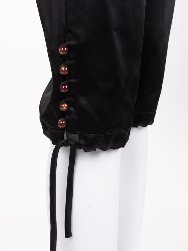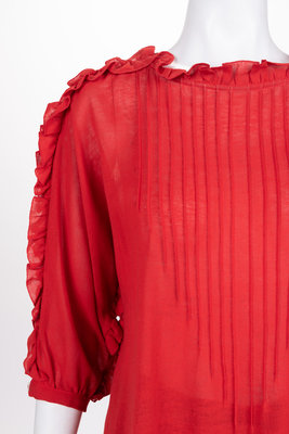 Red sheer crepe ruffled top with open neckline trimmed in ruffles, front pin tuck stitch detail, built in kimono style sleeves, and flared hemline; paired with matching red strap shell top and black satin breeches with side button detail, tieable hems, and front fly closure.