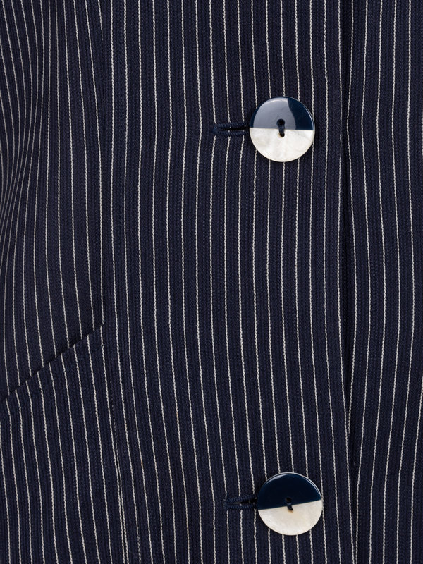 Navy and beige wool blend pin stripe shirt dress with notched collar, padded shoulders into long sleeves, front hip patch pockets, and front button closure.
