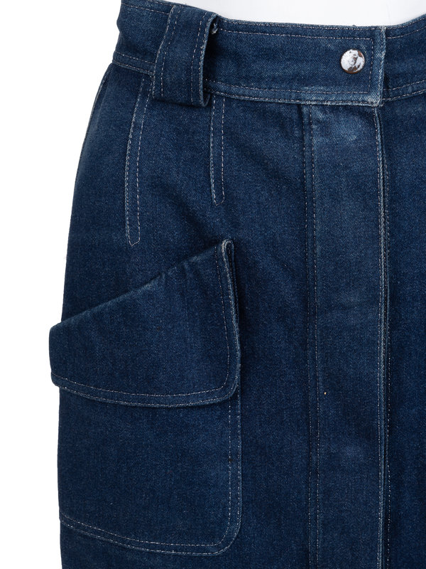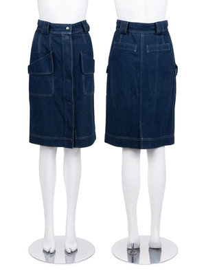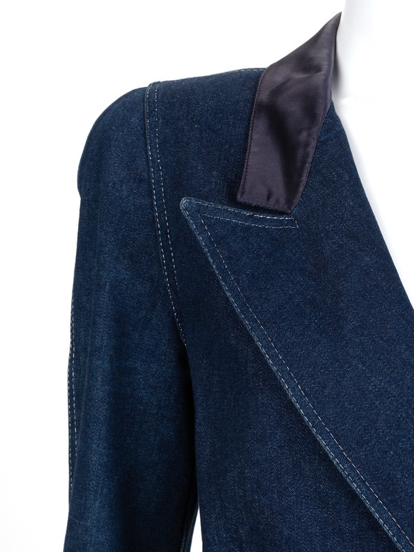 Blue cotton denim two-piece skirt ensemble including a long double breasted jacket with a peaked lapel trimmed in blue satin and silver thread top stitching, long sleeves with three buttons, three patch pockets, and front button closure; paired with matching denim skirt with front patch pockets and front snap closure.