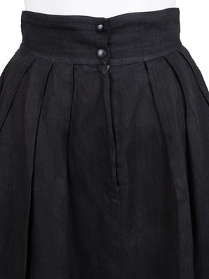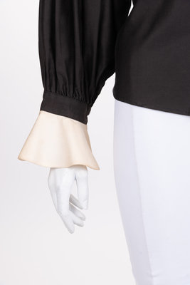 Brown and white cotton blouse with a convertible collar and yoked shoulders, full gathered sleeves with flounced cuffs, and front snap closure; paired with black linen pleated skirt with front zipper and snap closure.