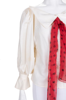 White polished cotton top with open neckline, rolled collar front with attached red polka dot silk chiffon necktie, full gathered cap sleeves with flounced cuffs, and front snap closure; paired with blue cotton/linen blend straight leg pants with front hip flap patch pockets and left side zipper closure.