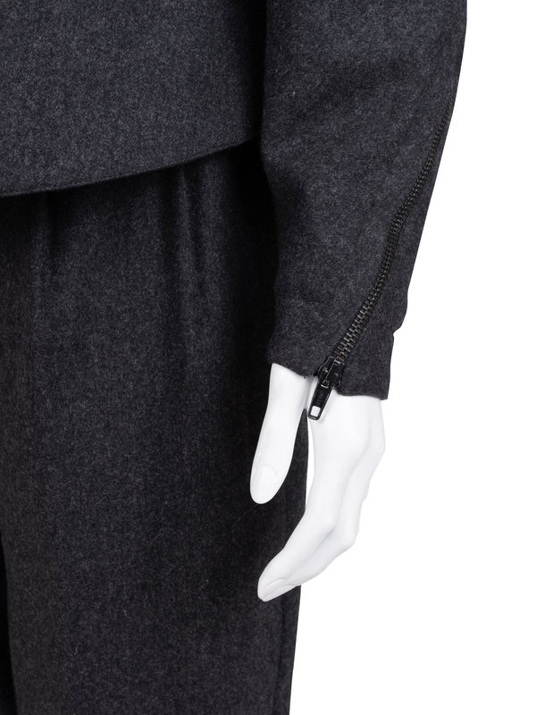 Gray wool two-piece pant ensemble including a cropped jacket with built up collar, raglan long sleeves, and front zipper closure; paired with matching slim cut pleated pants and front fly closure.