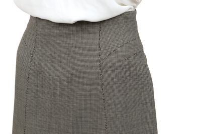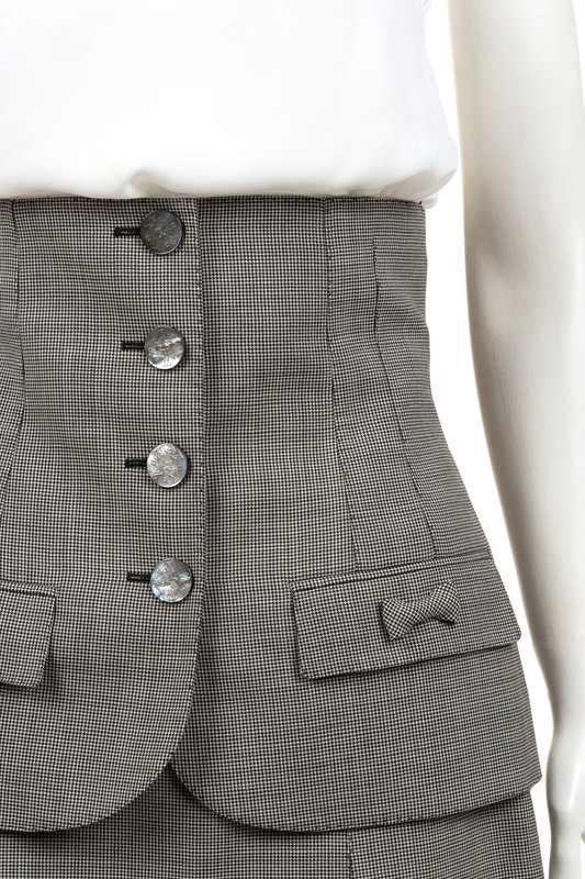 Black and white houndstooth two-piece skirt ensemble including a cropped corselet top with front flap hip pockets with bow detail, and front button closure; paired with matching paneled flared skirt with black velvet trim, tiered hemline, and center back zipper closure.