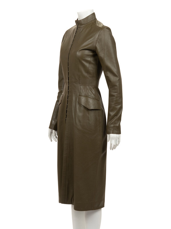 Olive green goatskin leather coat with stand collar, fitted two-piece long sleeves, straight skirt, hip flap pockets, and front hook and eye closure.