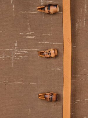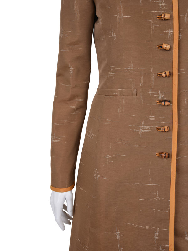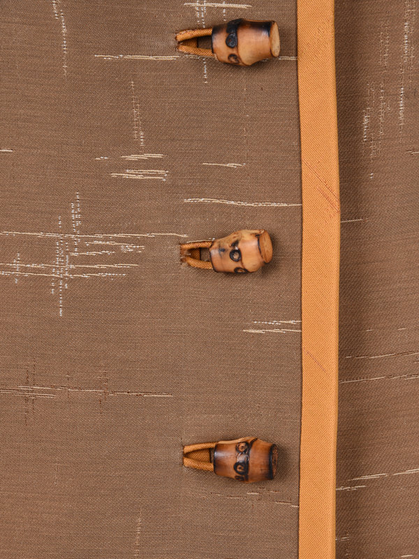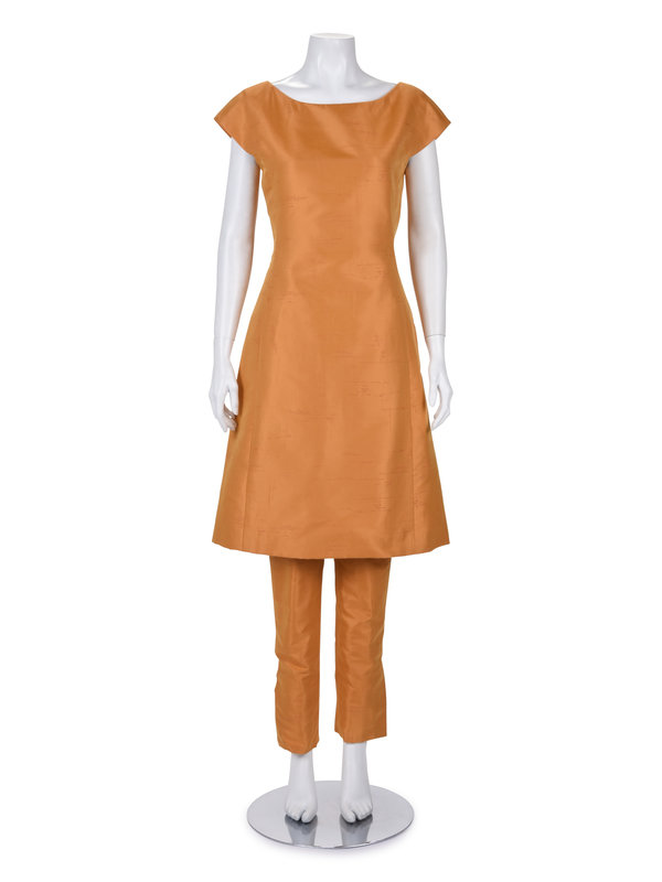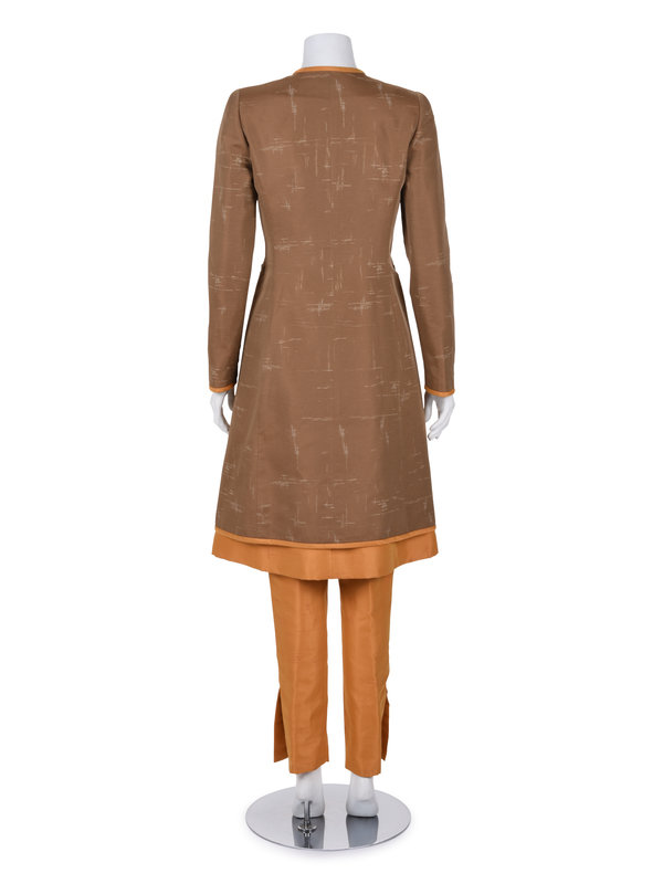 Three-piece pant ensemble including a brown cross-hatched patterned long sleeve jacket trimmed in orange silk taffeta, clean neckline, A-line skirt, and front wood buttons; paired with an orange silk A-line dress with a cross-hatched pattern, built in cap sleeves, and center back zipper closure and orange silk cropped pants with a cross-hatched pattern, two back pockets, and zipper closure.