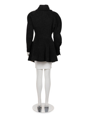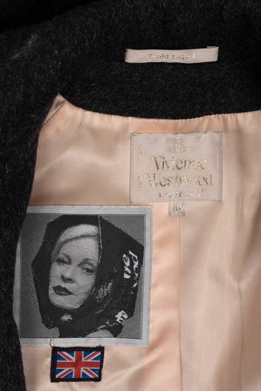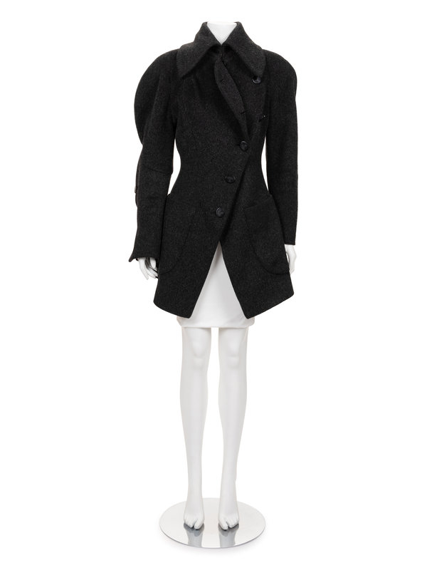 This jacket was likely retailed among Vivienne Westwood’s Storm in a Teacup collection for Fall/Winter 1996. The exaggerated shoulders recall the shape of leg-of-mutton sleeves. This type of sleeve has come in and out of fashion for centuries but reached its largest size in the late Victorian Era, a period often echoed in Vivienne Westwood’s creations. This jacket combines the excessive volume of women’s fashion with an essence of men’s military dress in the fitted waist.