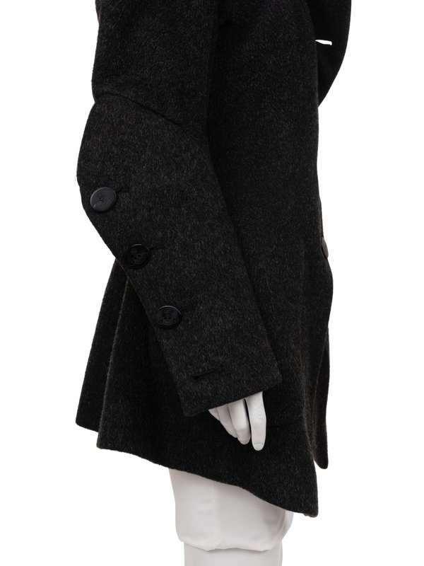 Gray fleeced wool coat with oversized rolled collar, stylized leg-of-mutton long sleeves with fitted cuffs, hip patch pockets, and front asymmetrical button closure.