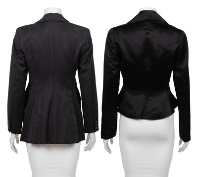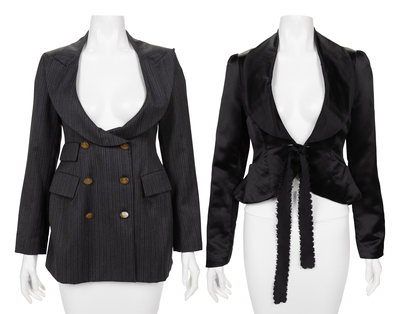 Black satin cropped jacket with shawl lapel, long sleeves, and front ribbon tie at waist.