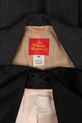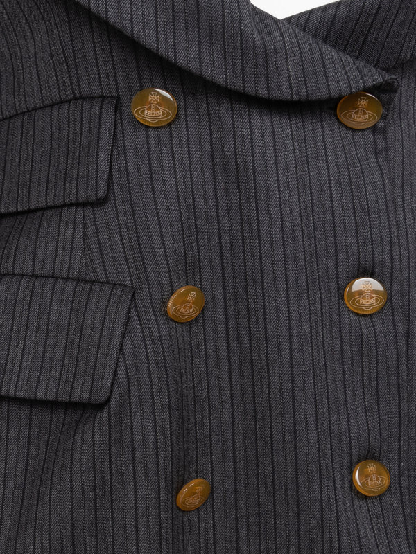 Grey and black striped wool double breasted jacket with deep peaked shawl lapel, set in long sleeves, three front flap pockets, and front button closure.