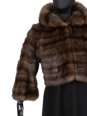 Brown Russian sable fur cropped coat with rolled collar, flared sleeves, and front hook and eye closure. "JLS" monogrammed in front right lining.