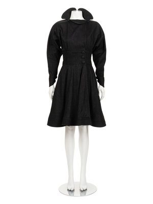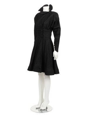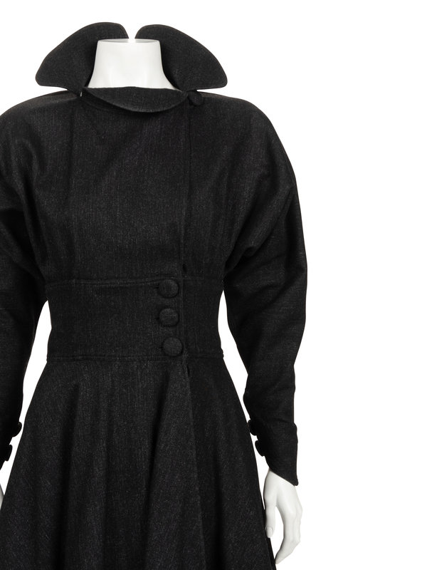 Dark gray wool coat with stylized convertible collar, built in dolman sleeves with buttoned cuffs, fitted waist with gathered full skirt with top stitched hemline, and front button closure.