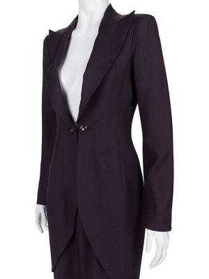 Purple viscose/linen blend two-piece skirt suit including a long jacket with peak lapels and deep neckline, fitted long sleeves, and front chain/button closure; paired with matching straight fit skirt with zipper closure.