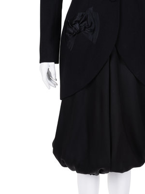 Black wool blend crepe jacket with shawl collar, satin bow detailed pockets, and front button closure; paired with black silk satin breeches with bubble hems.
