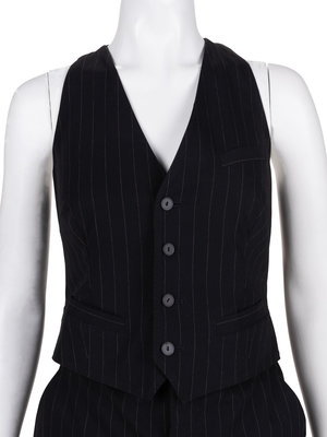 Black with tan wool blend pinstripe romper with attached vest style top and straight fit skirt with front button and zipper closure.