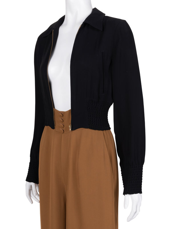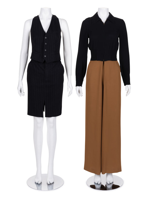 This lot includes one jumpsuit and one dress. The jumpsuit was look 15 in Gaultier’s Spring 1997 ready-to-wear collection, a single trompe l’oeil piece which resembles a bomber jacket and pant ensemble when zipped; unzipped, it “expressed the designer’s signature charm and humor in a more elevated way.”