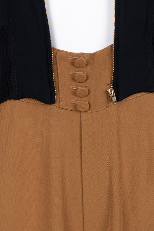 Black crepe military style jacket top jumpsuit with ochre crepe wide leg pants, front jacket zip up, and center back zipper closure.