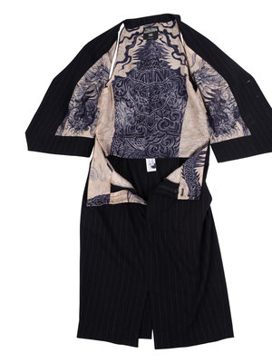 The pinstripe dress retailed for Gaultier’s iconic Spring/Summer 1994 Les Tatouages collection, a controversial, cross-cultural mélange of reference points, held together by Gaultier's fascination with body modification. The interior lining of this dress reveals a tattoo-inspired print produced for this collection and is an emblematic example of Gaultier's work: often daring and always wearable.