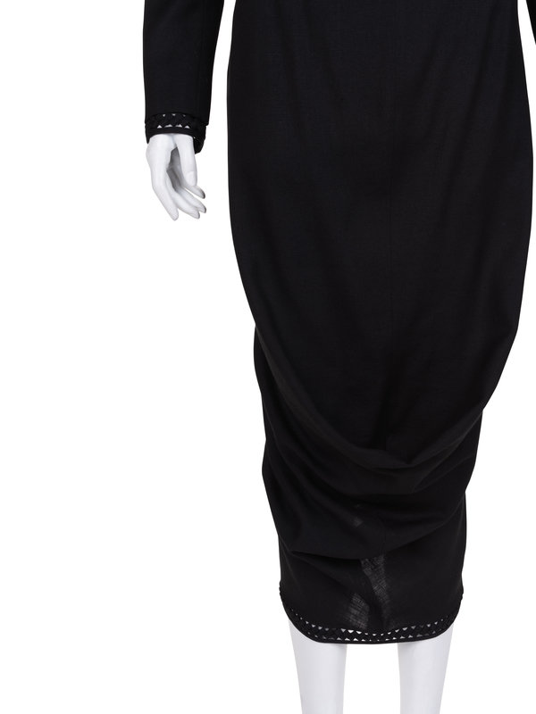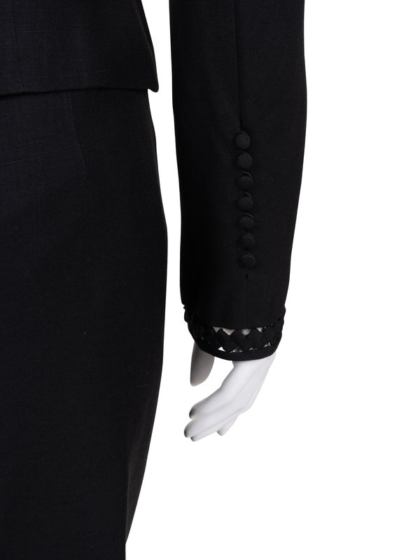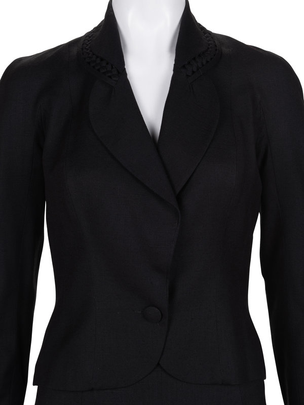 Black viscose/linen blend two piece skirt ensemble including a fitted jacket trimmed with braided detail, rounded notch collar, built in long sleeves and front button closure; paired with matching drape front high waist skirt trimmed in braided detail, and back zipper closure.
