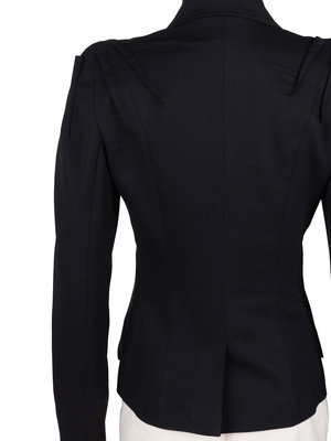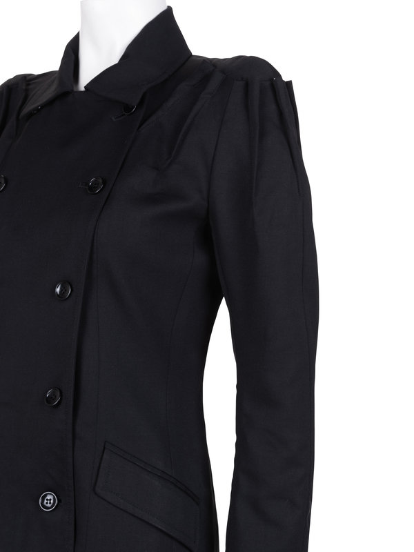 Black wool blend double breasted jacket with convertible collar, darted shoulders/sleeve cap long sleeves, and front button closure.