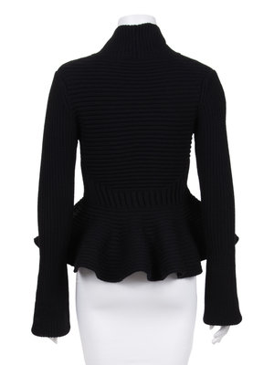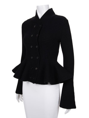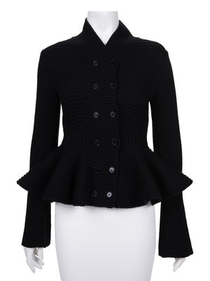 Black wool ribbed knit double breasted jacket with built up collar, flared long sleeves, flared hemline, and front button closure.