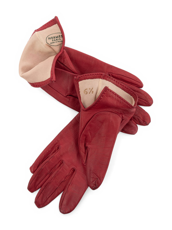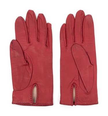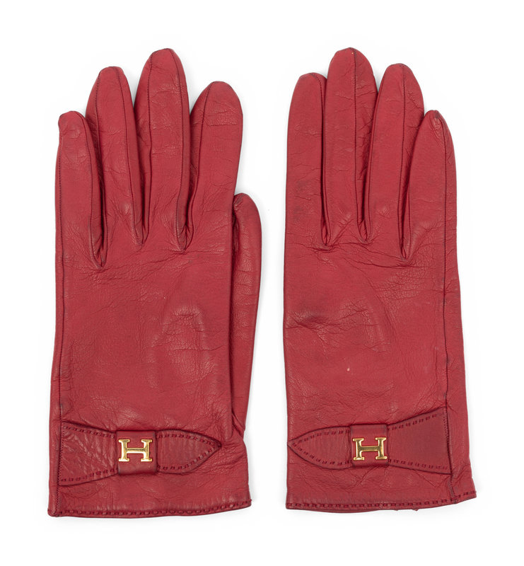 Red calfskin leather gloves with gold-tone metal H on wrist tabs.