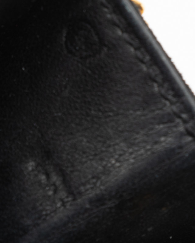 Black quilted suede envelope flap bag with side gold-tone metal chains and front snap closure. 1973.