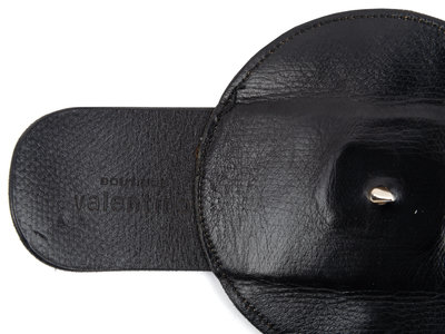 Black leather belt with cording detail on the edges, a cording diamond pattern on the front, and lace up notches.