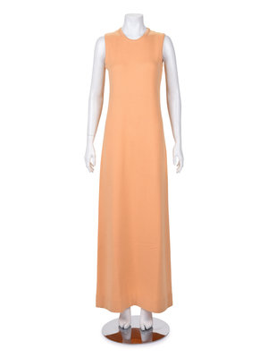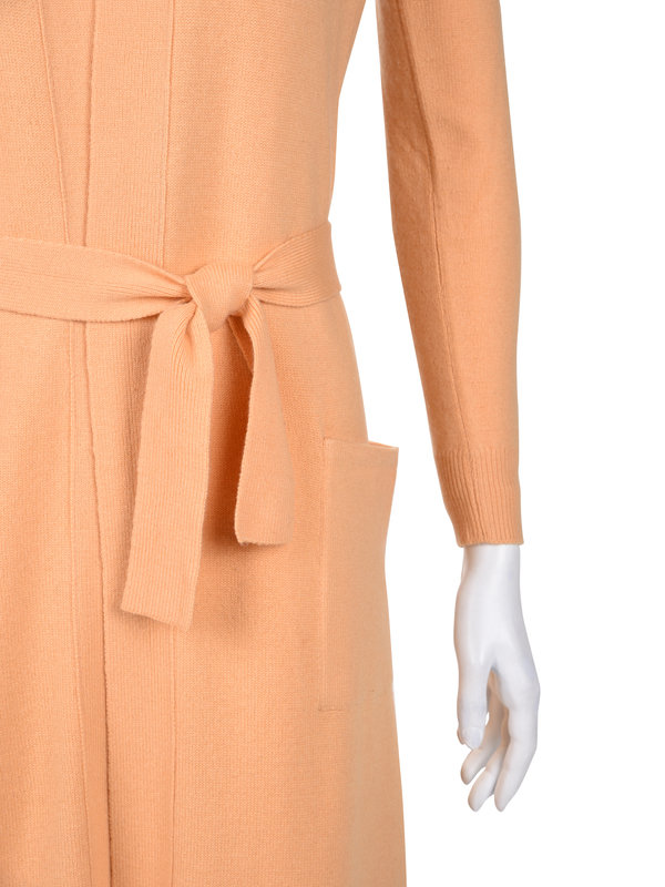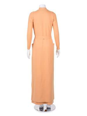 Light orange cashmere knit two-piece dress ensemble including a sleeveless maxi dress with flared skirt; paired with matching long sleeve open front duster with hip patch pockets and matching tie belt.