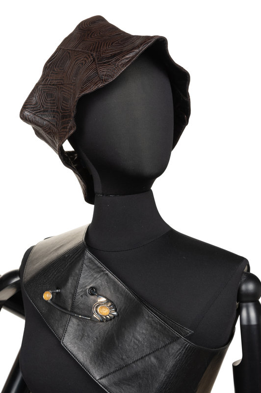 Black and brown leather turtle shell embossed pattern corselet with front snap closures.