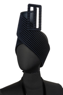Blue striped velvet belt with large buckle.