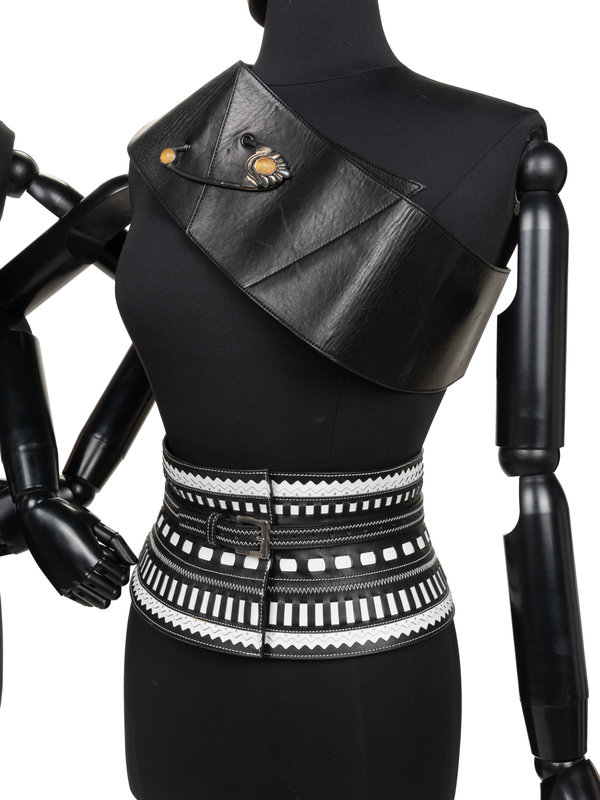 Black and white leather geometric belt.