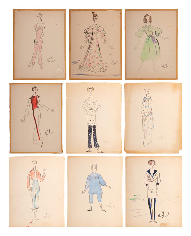 Nine illustrations depicting various looks including day evening wear. The figure depictions resemble familiar actors Barbara Streisand, Audrey Hepburn, and Julie Andrews.
