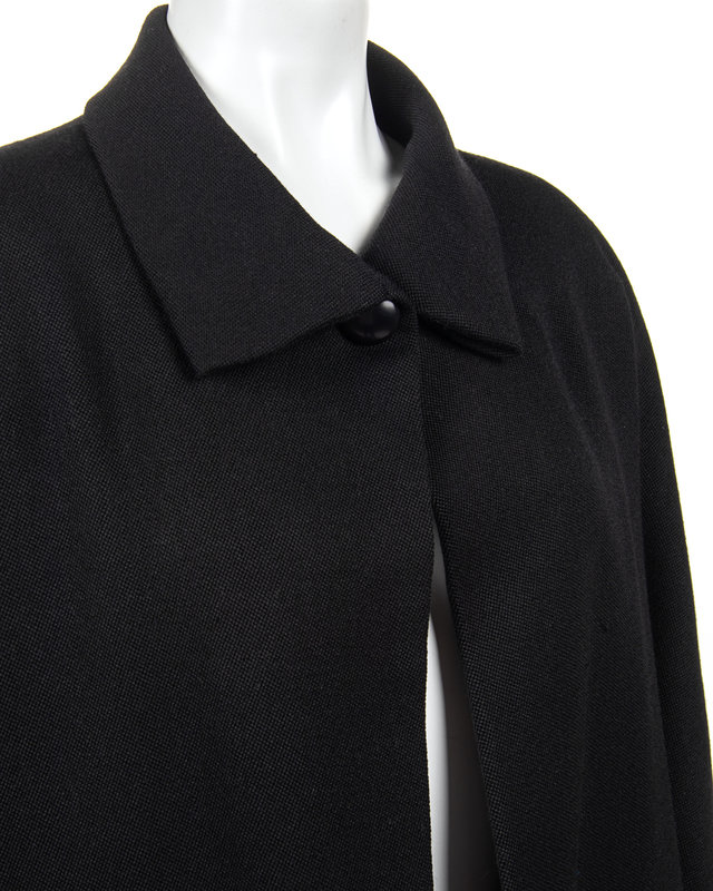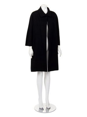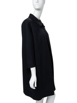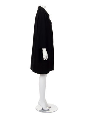 Black wool long sleeve coat with rolled collar, built-in sleeves, front hip slit pockets, and single button closure at neckline.