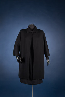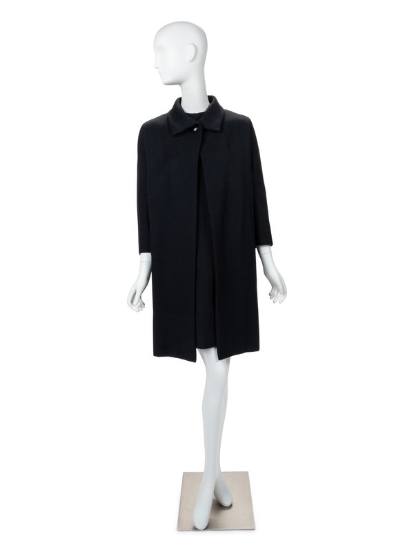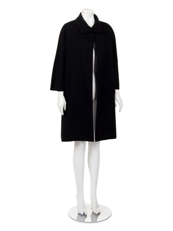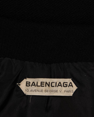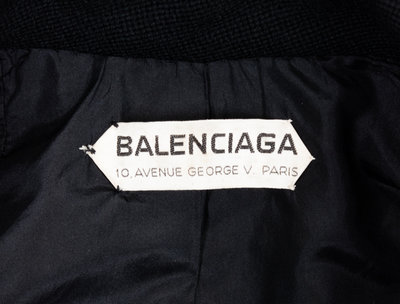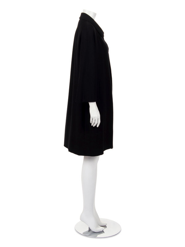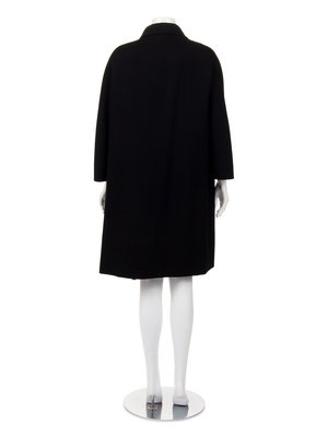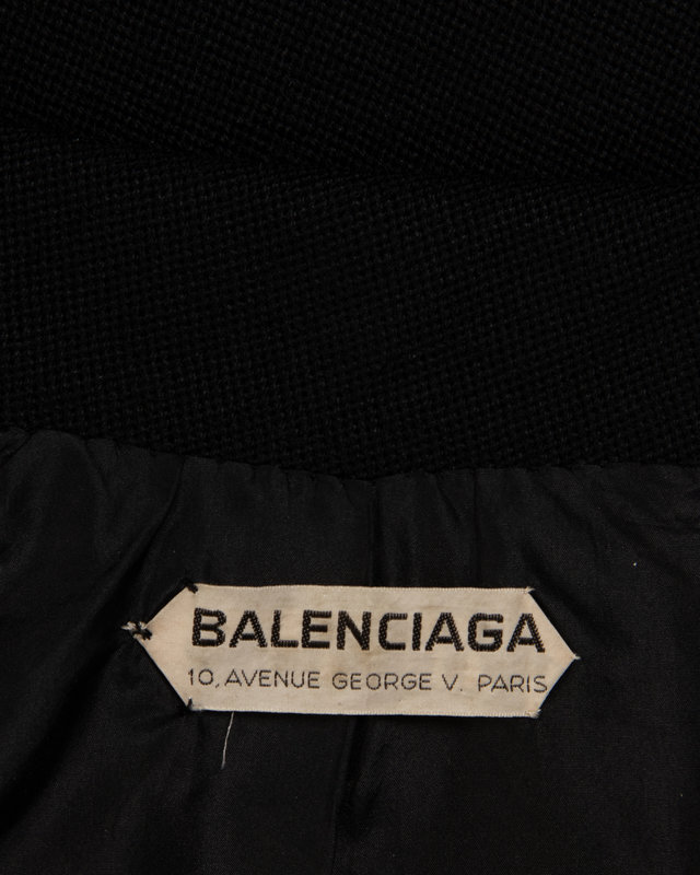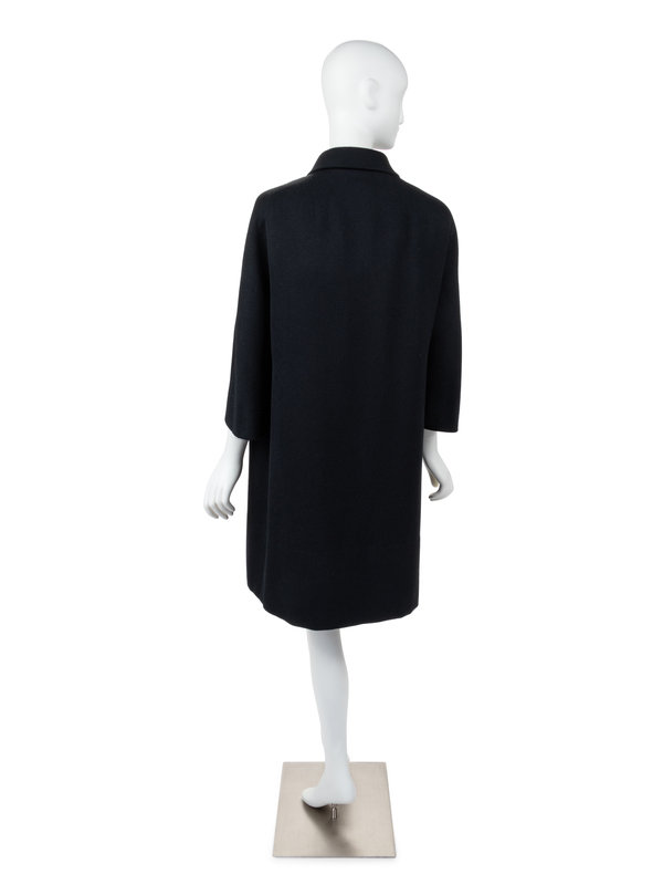 The silhouette of the coat is supported by internal layers of padding that extend down the front and back of the body from the shoulder. The padding smooths the shoulder line and widens the silhouette to achieve the famous Cocoon shape of the 1940s-1960s, which Balenciaga helped to introduce.