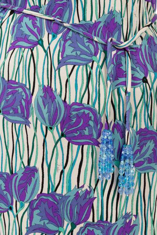 White, blue, and purple floral print knit sleeveless sheath dress; paired with matching tie belt embellished with beaded tassels.