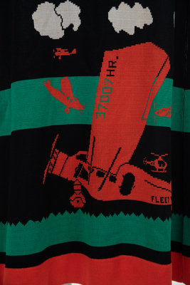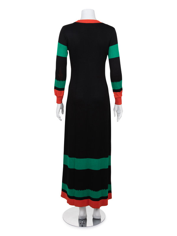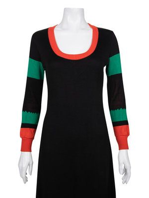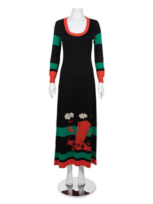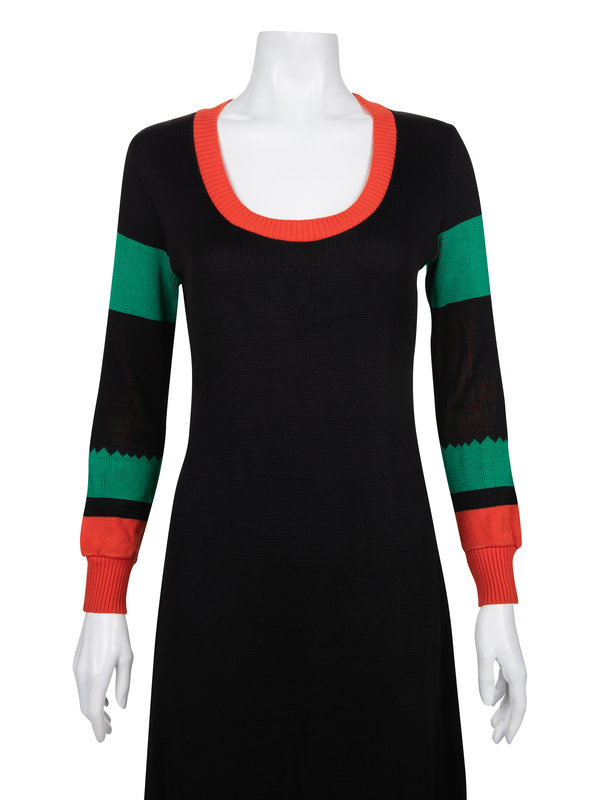 Black knit long sleeve maxi dress with orange, green, and white airplane motif on the front, orange ribbed deep scoop neckline, rib knit cuffed sleeves and flared skirt.