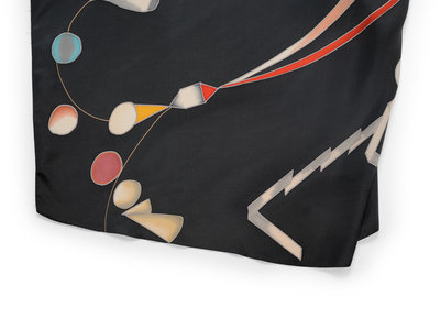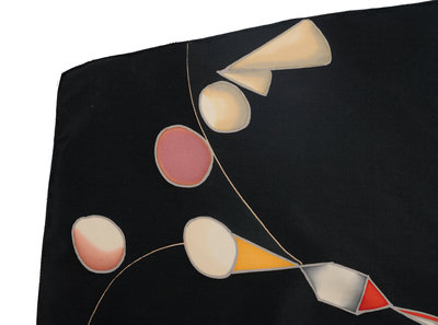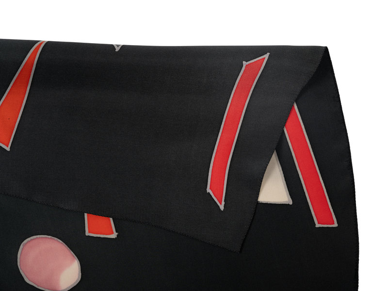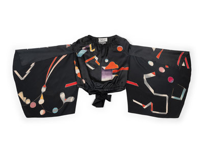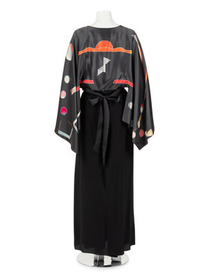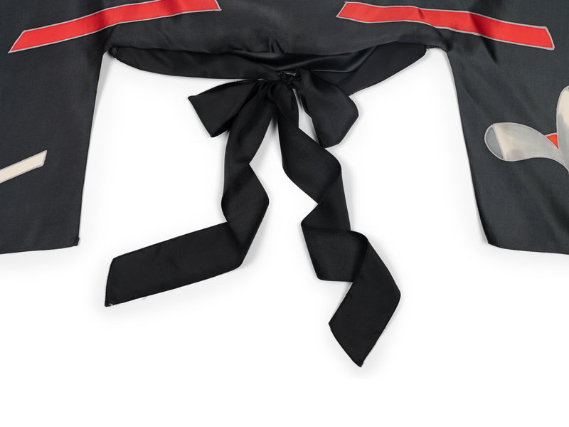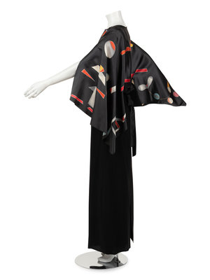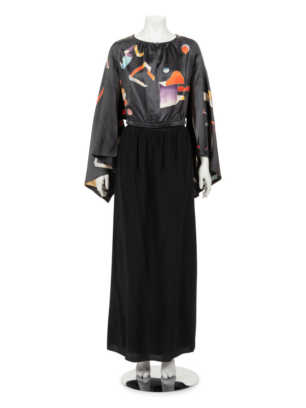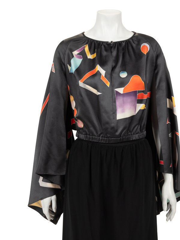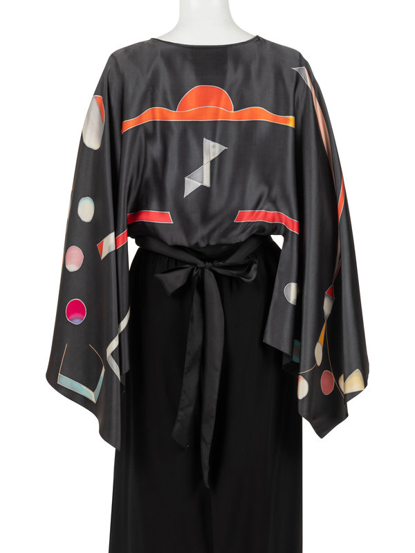 Gray hand painted silk top with raglan kimono sleeves, bloused body, and attached satin tie sash at waist; paired with layered black silk crepe skirt with flared hem.